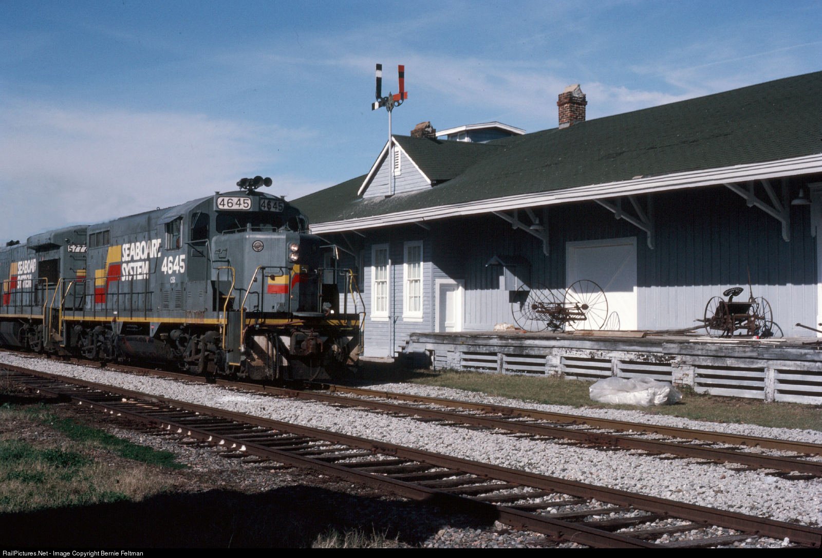 CSX GP16 #4645, in pristine Seaboard System paint scheme, has worked to the end of the branch at Elba, AL and is returning to the junction at Waterford, AL. The depot, now a museum, was replaced by a small block building just west of here. #4645 was built September 1956 as Seaboard Air Line GP9 #1925 and later became Seaboard Coast Line #1024. Unit was rebuilt as a GP16 in November 1982 and later became CSX #1745. Unit was retired from CSX roster 6/25/1992 and became R. J. Corman (RJCR) #1745 and later Aberdeen Carolina & Western Railway (ACWR) #1601