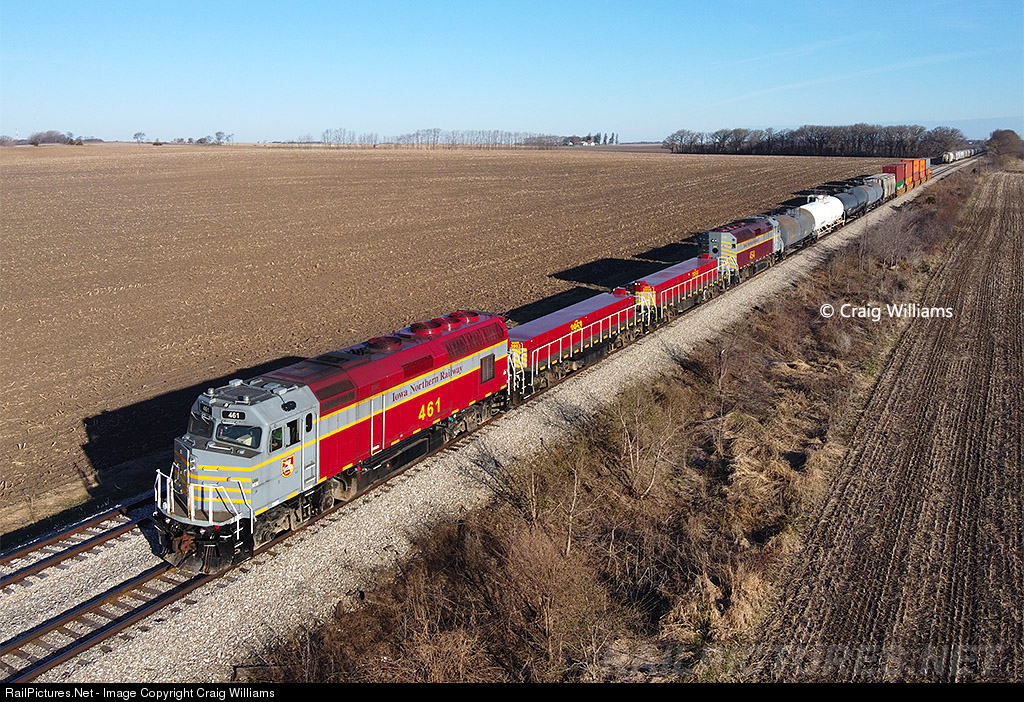| The Iowa Northern's North Crew slowly roll south on the Manly Sub outside of Nora Springs. The crew will stop and do work here at Nora Springs with the CP in a few miles. The rear car is a 5-packers full of the new business IANR got beginning of 2020 that is going to the Butler Logistic Park from the UP at Manly. I wanted to get some photos of the new business but today it was combined with the North Job. |