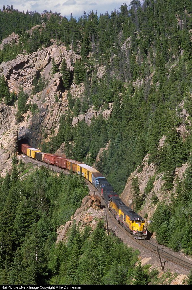 Union Pacific’s MDVRO freight exits Tunnel 27 in the Tunnel District east of Pinecliffe, Colorado, on June 15, 2001. Leading the train is UP EMD SD40T-2 No. 8571, formerly Rio Grande No. 5343.