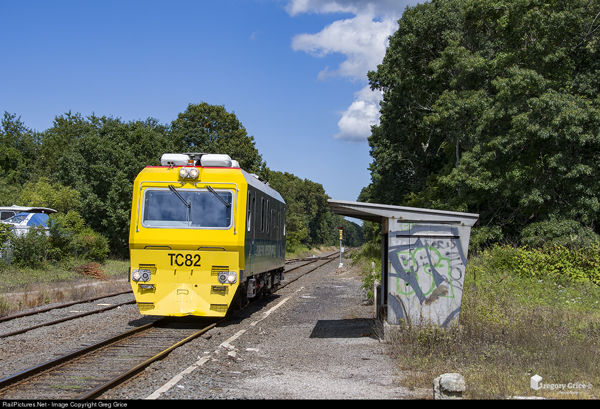 Long Island Rail Road's "TC-82" Track Geometry Vehicle heads west past the abandoned Calverton Station on the Main Line near Riverhead, NY. The TC-82 is a Track Geometry Vehicle built by Plasser American Corporation for track inspections throughout the Long Island Rail Road system.
