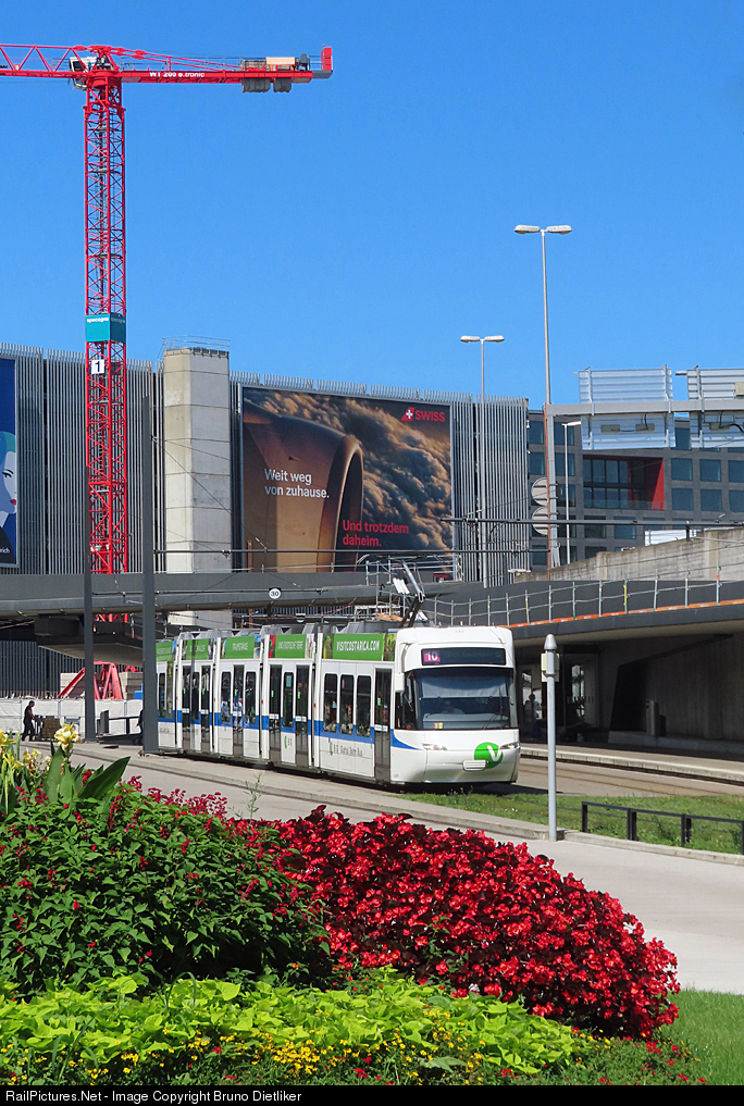 | Beautiful flowers near the station Flughafen (= Airport): tramway line 10 toward Zürich leaves the station |