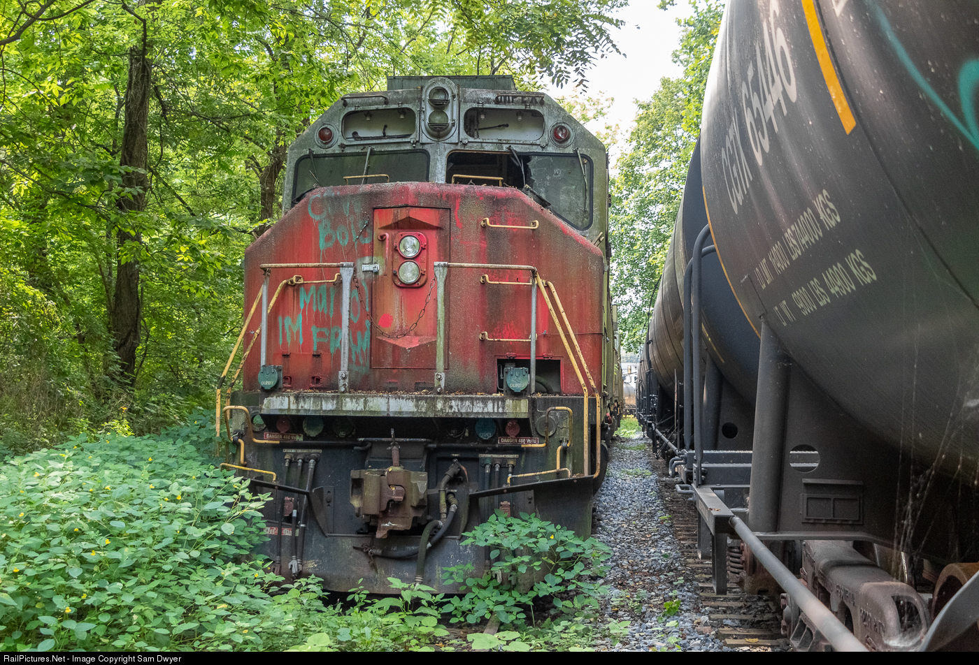 Spiders, Rust, and Grafitti MPEX 57, an ex-MARC GP40WH-2 is seen rusting away in the Columbia dead line. This unit was retired from MARC service and sold off to MPI a few years ago and it was stored near a scrap metal facility in Columbia. For the past few years, 57 along with two other identical units have been sitting here abandoned, likely awaiting scrap. Over the years windows have been smashed, the locos have been looted for horns, bells, and numberboards, and nature has taken its toll. I'd venture to guess that these three units are broken beyond repair and will be scrapped on site.