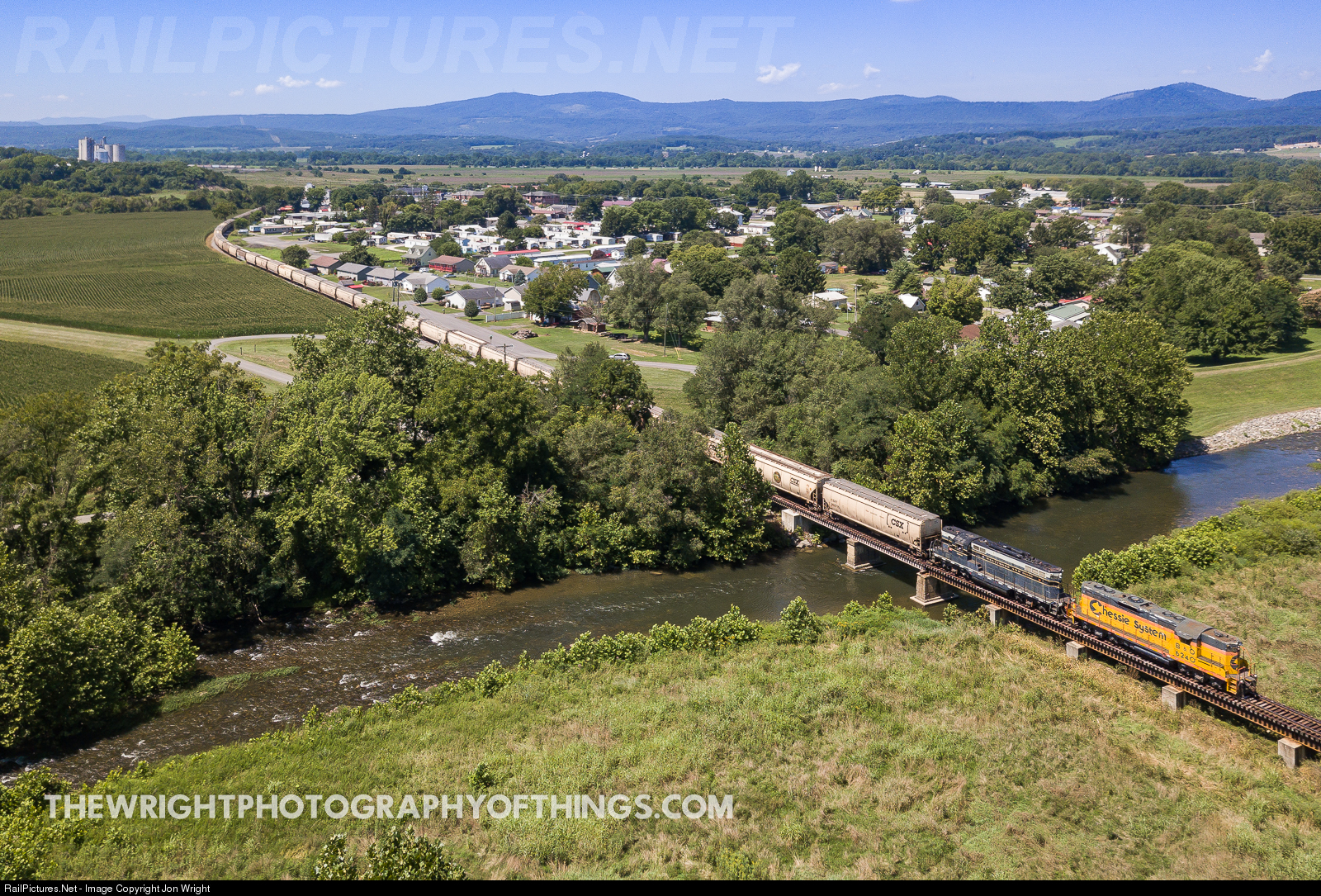 Crossing over the South Fork South Branch of the Potomac River. Two venerable locomotives push 32 loaded grain cars towards the Pilgrim's Pride mill seen in the distance. 12 additional cars will be set off for Petersburg, WV. B&O 6240 built as C&O 6240 in the standard C&O paint in 1957 was transferred to the B&O and into Chessie colors and remains so to this day. B&O 6604 built in 1955 for passenger operations and numbered 751 was then painted into Chessie colors until its arrival in the early 1990s when it was painted back to it's original B&O livery.