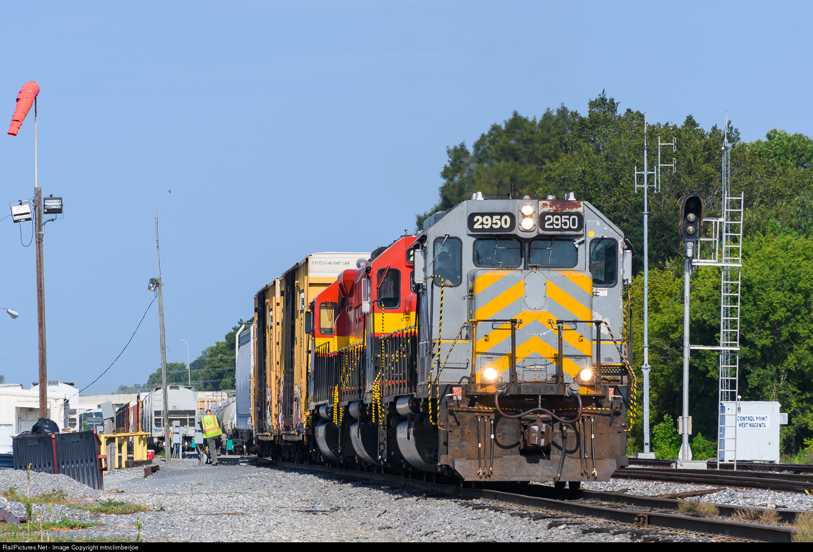 | A Kansas City Southern local crew works the small yard on the east side of Monroe, Louisiana kicking cars into blocks. On the point is KCS 2950, a GP40-3 still wearing the KCS "gray ghost" paint scheme. |