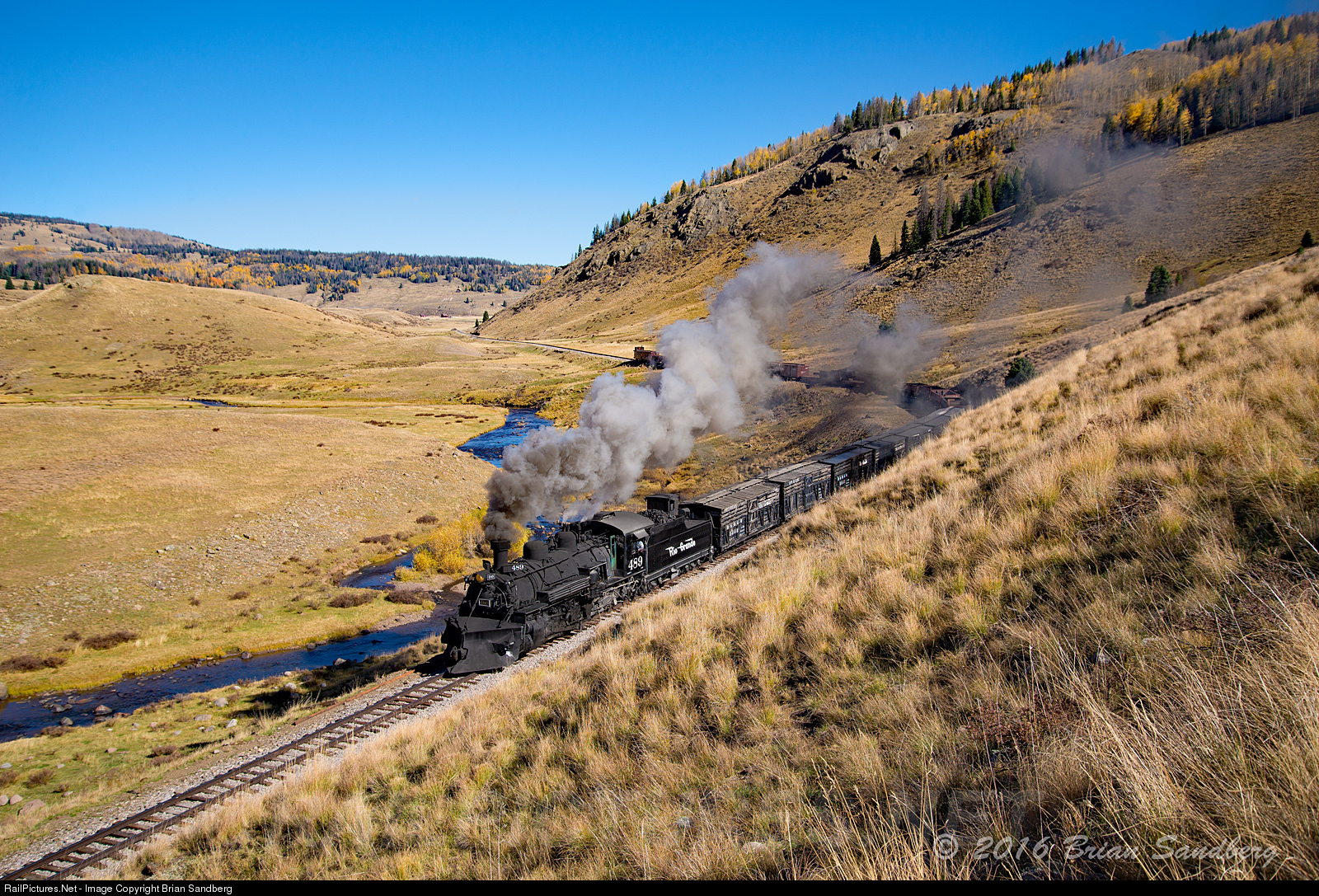 | D&RGW K36 #489 leads the 2016 Fall Photo Freight through the Los Pinos Valley enroute to Osier seen here at Los Pinos, CO 10/5/16. This is the second of a two day 2016 Fall Photo Freight organized by the Friends of the Cumbres and Toltec. |