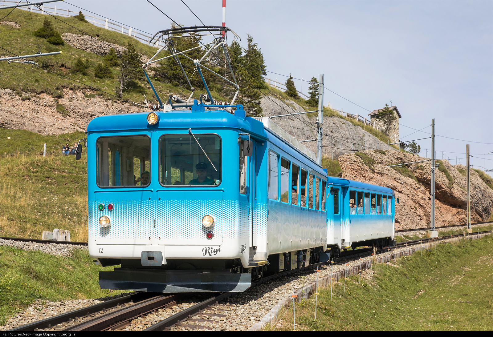 | Cogwheel railcar BDhe 2/4 # 12 and cab car Bt # 22 of the Rigibahnen (former Arth-Rigi-Bahn ARB) is running down the mountain as train 162 from Rigi Kulm to Arth Goldau. This vehicles were built in 1949 by SLM and SAAS. |