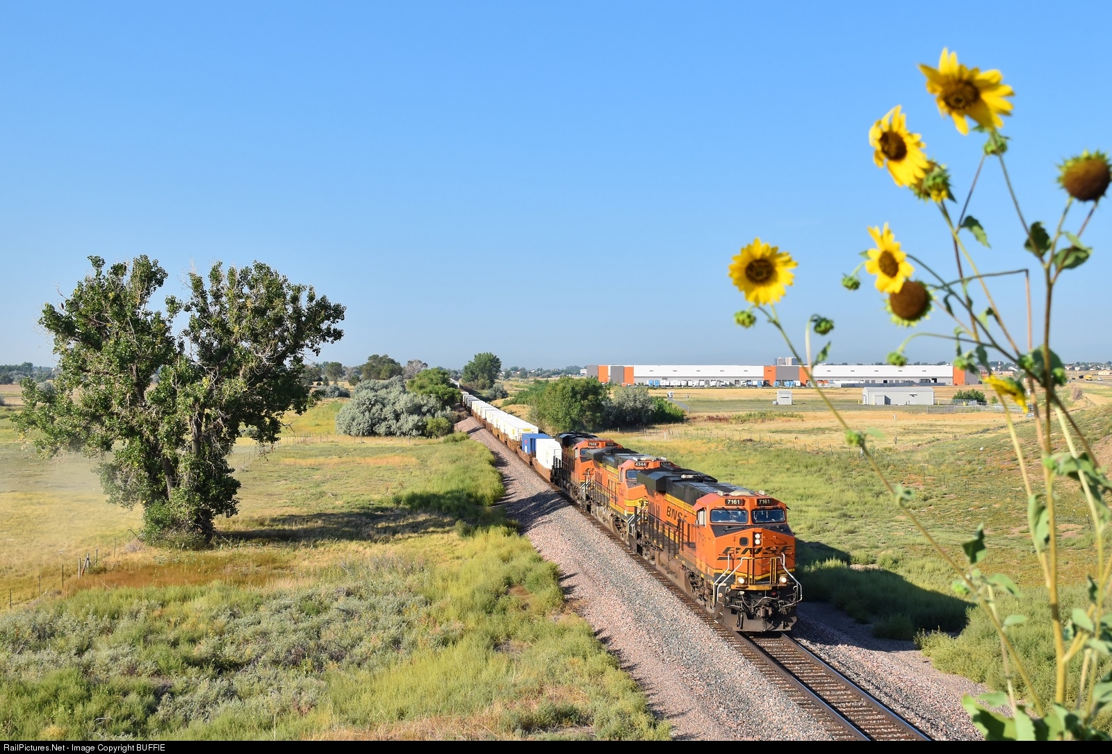 | A BNSF Z train lead by 7161 (ES44DC) runs eastbound on the Brush Sub through Brighton, Colorado, passing between trees and a stalk of sunflowers growing on the overpass that spans the tracks. |