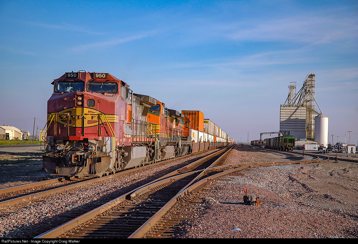 BNSF Guaranteed Intermodal Service train Q-CLORIC1-07, making its way from Clovis NM to Richmond CA, sits in the siding at Angiola, at milepost 942 of the Bakersfield Sub, ss it awaits a late afternoon meet with southbound Amtrak 716, a San Joaquin heading to Bakersfield from the Bay Area. BNSF Dash 9-44CW 950 (ex-ATSF 950), Dash 9-44CW 4905 and Dash 8-40B 8637 (ex-ATSF 7447) are heading up this intermodal train. (Angiola, California – March 9, 2008)