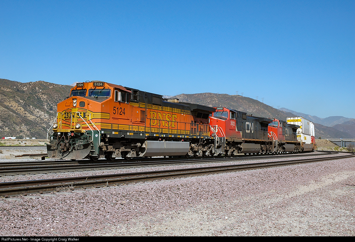 BNSF Railway train Q-CHISBD6-30A has nearly completed its trip from Chicago, as its destination of San Bernardino is but ten miles ahead. A trio of GE Dash 9-44CWs is providing the power – not unusual on the BNSF. However, two of these units are not the usual power, as Canadian National 2622 and 2694 are MUed with BNSF 5124. (Devore, California – August 2, 2008)