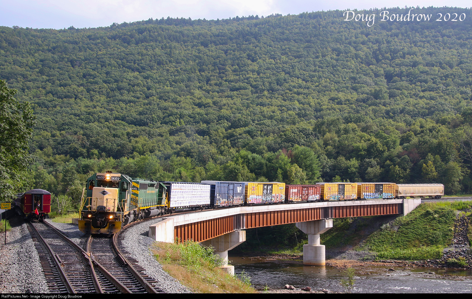 | The Reading & Northern NRFF (North Reading Fast Freight) is seen cutting across "The New Bridge" as the scenic train has pulled into the clear. The Fast Freight will then take the old CNJ route through Lehigh Gorge eventually arriving at the yard in Pittston. |