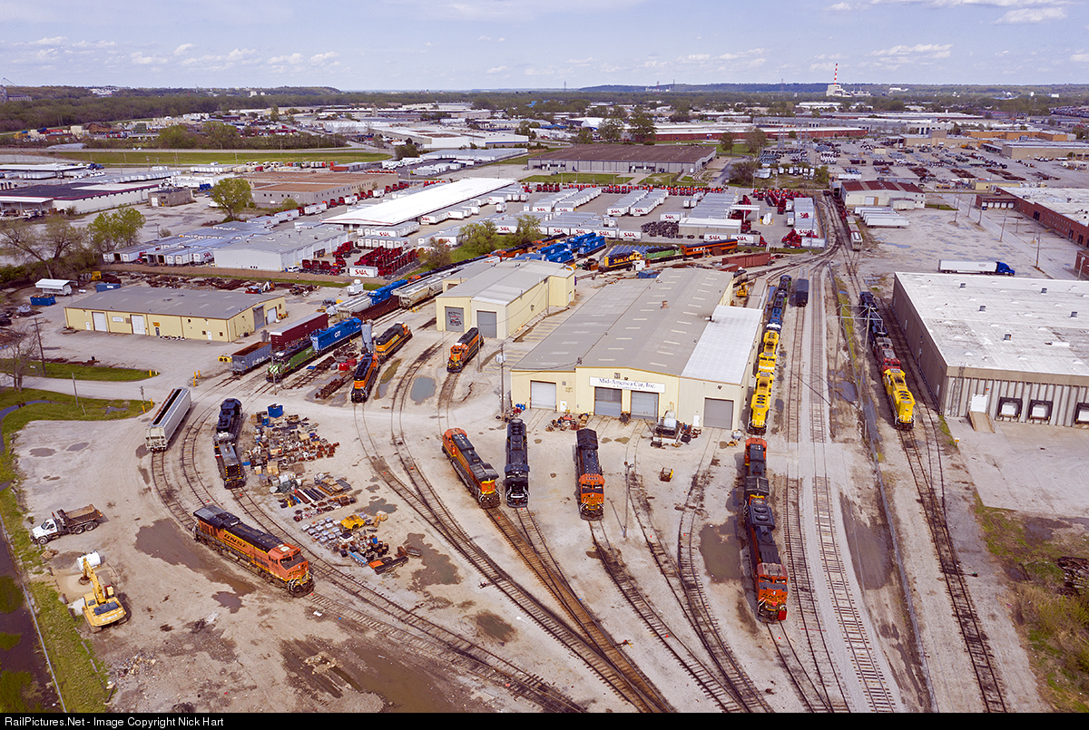 In this aerial view of Mid-America Car in Kansas City, we see a wide variety of locomotives waiting to take a trip through the shops. Some may not make it out of here in their current paint scheme and some may just be in for something simple, like PTC installation.