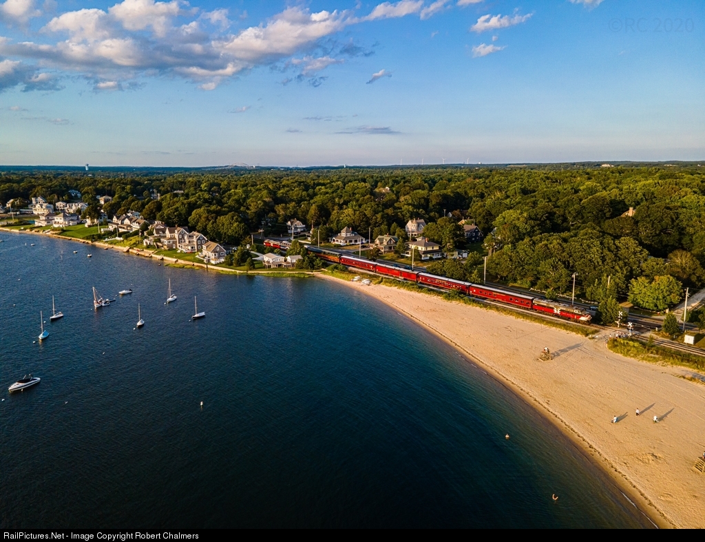 On a beautiful evening, Mass Coastal’s Dinner train rolls by Monument Beach at the start of golden hour.