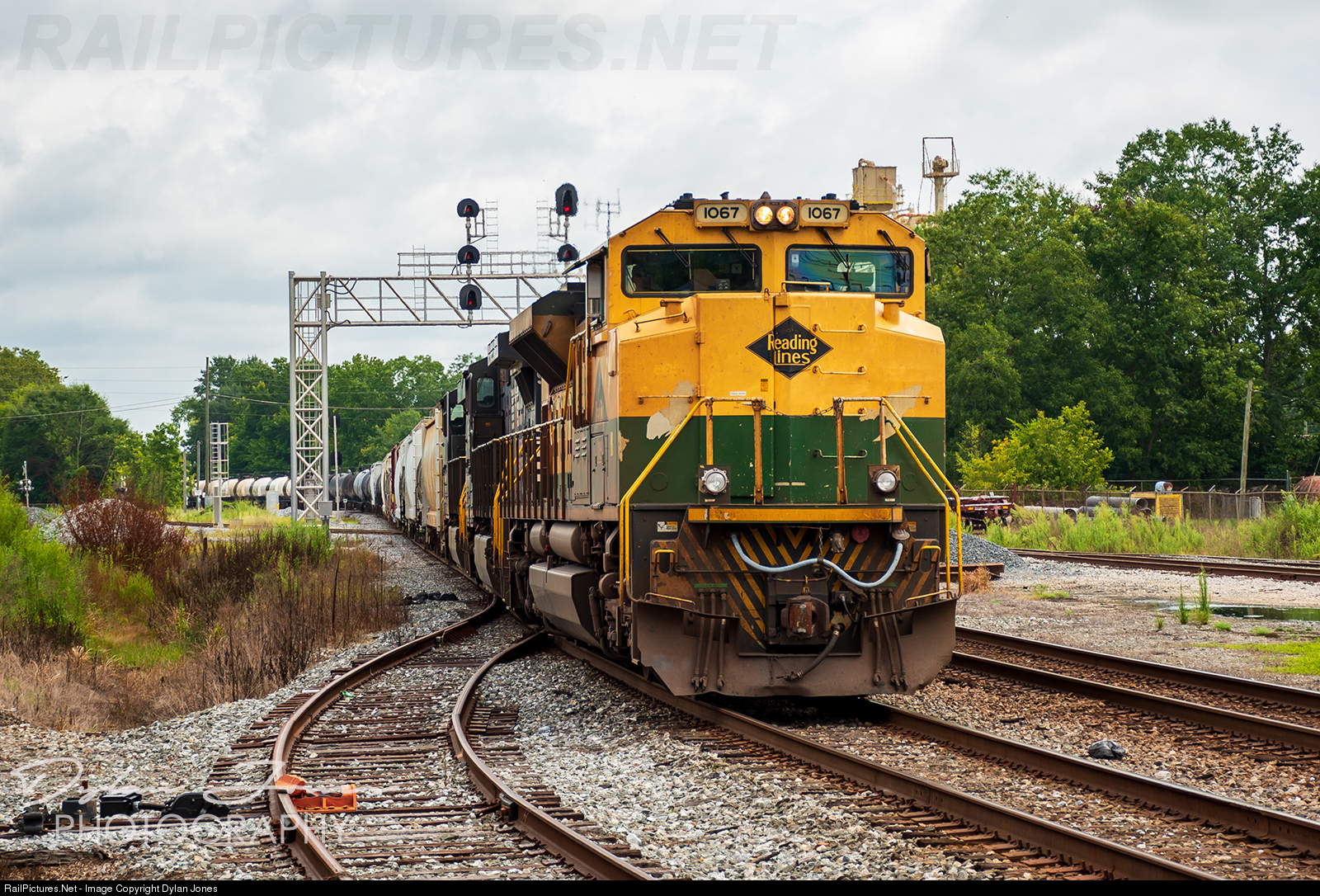 | The Reading Heritage unit lead NS train 345 this morning. Here we see the train rolling through the KCS/NS Diamond in Meridian as Engineer David Light eases the train to a stop to wait for Amtrak. |