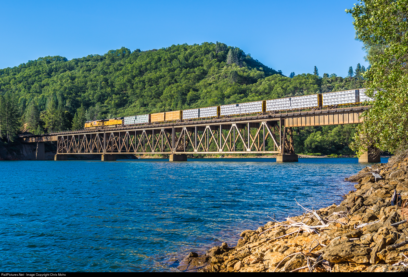 Back in 2017, it had been many years of drought conditions since Shasta lake was full of water. Now after a couple of years Rain and Snow the lake is at capacity. Crossing a full Lake Shasta over the Lakehead Bridge, a Union Pacific lumber train sends lumber south from the Pacific Northwest.