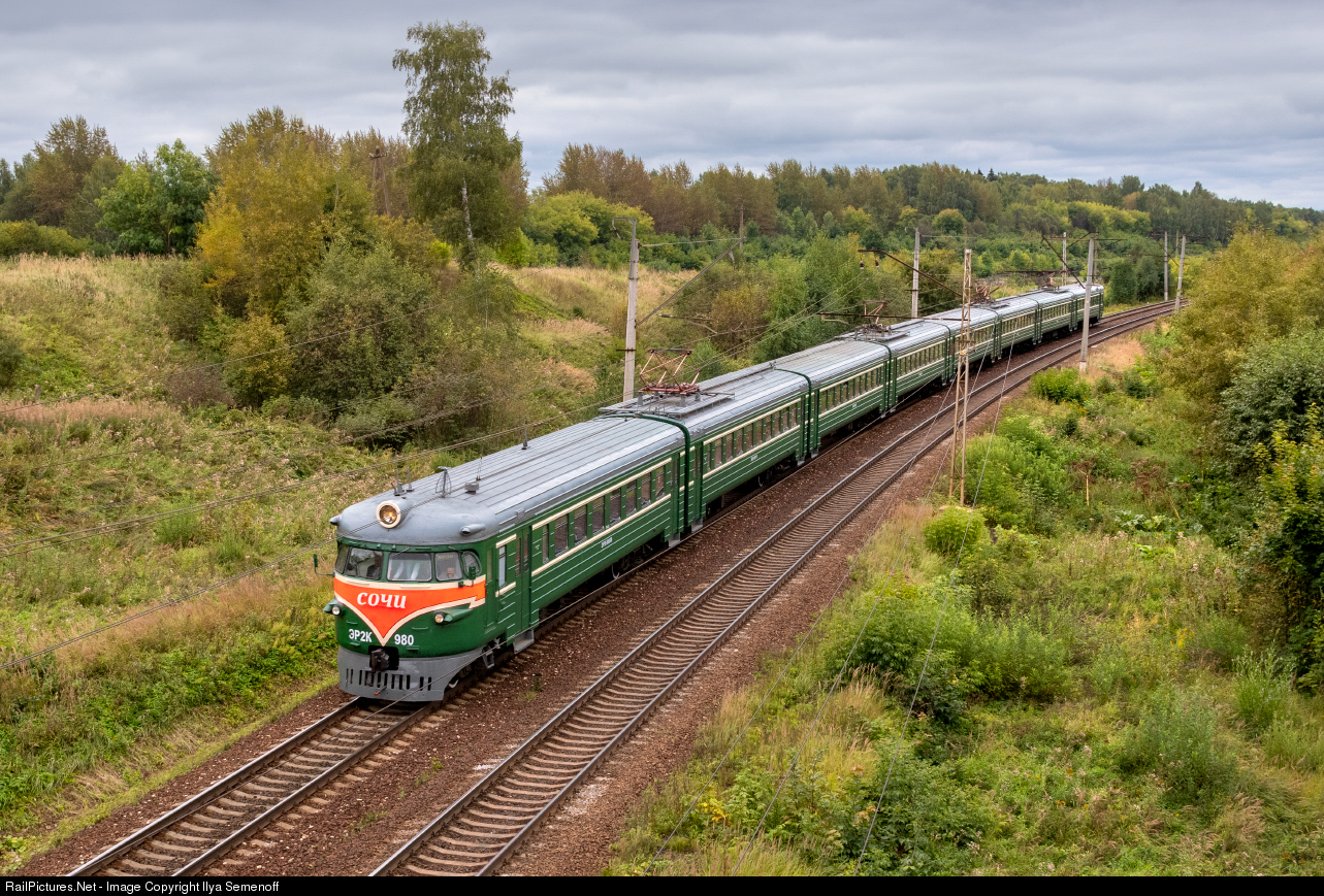 | The last green USSR colors ER2K-980 EMU train runs from Moscow to Yakhroma. The electric train was built in 1972. This type of electric train is distinguished by the round shape of the head cars. This design was trendy in the middle of the 20th century and now is very revered among railway fans. Currently, there are only few trains with such design in Russia. |
