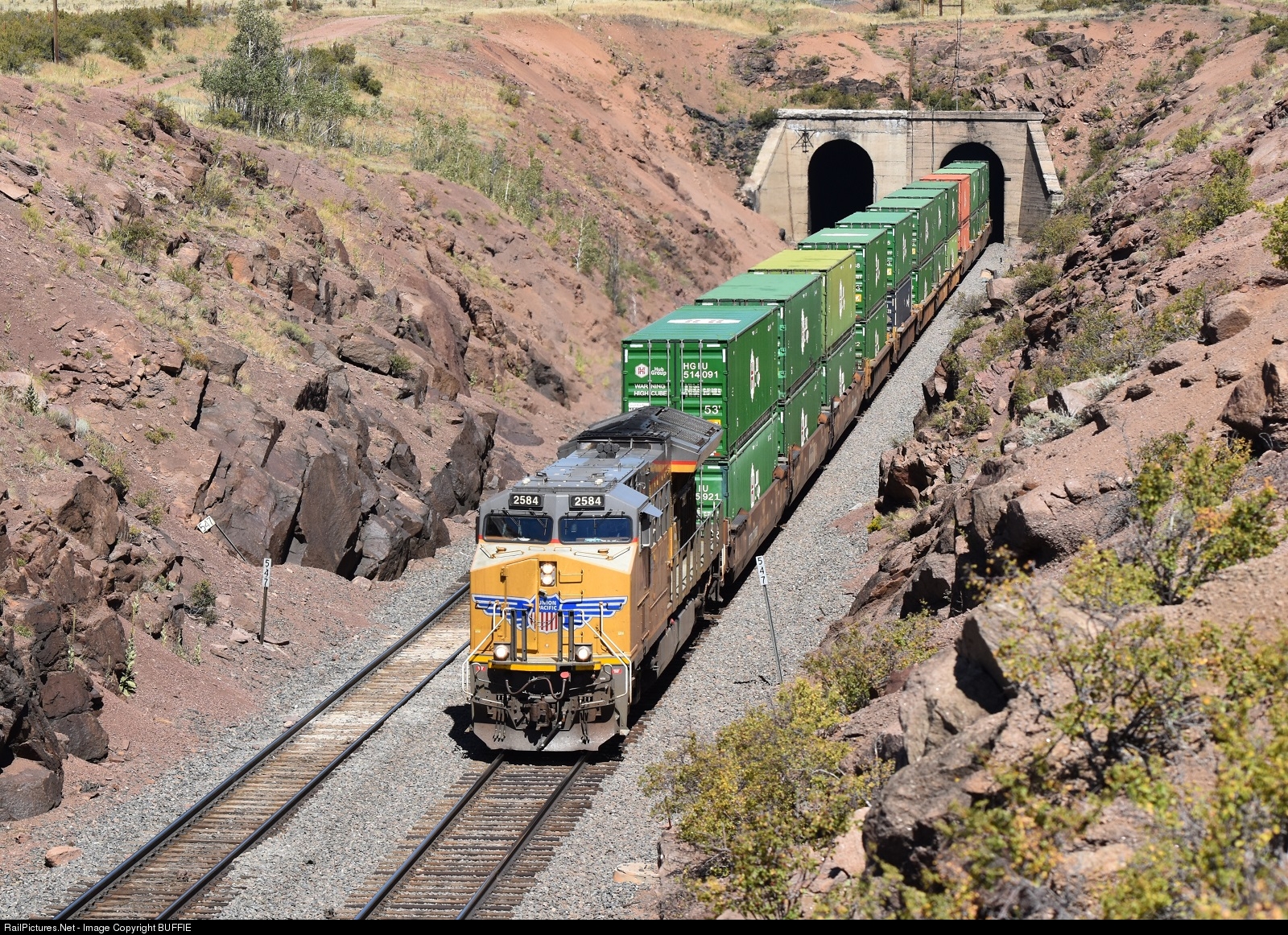 Union Pacific engine 2584 (ET44AC) runs solo as it leads a stack train out of the Hermosa Tunnels in Wyoming.