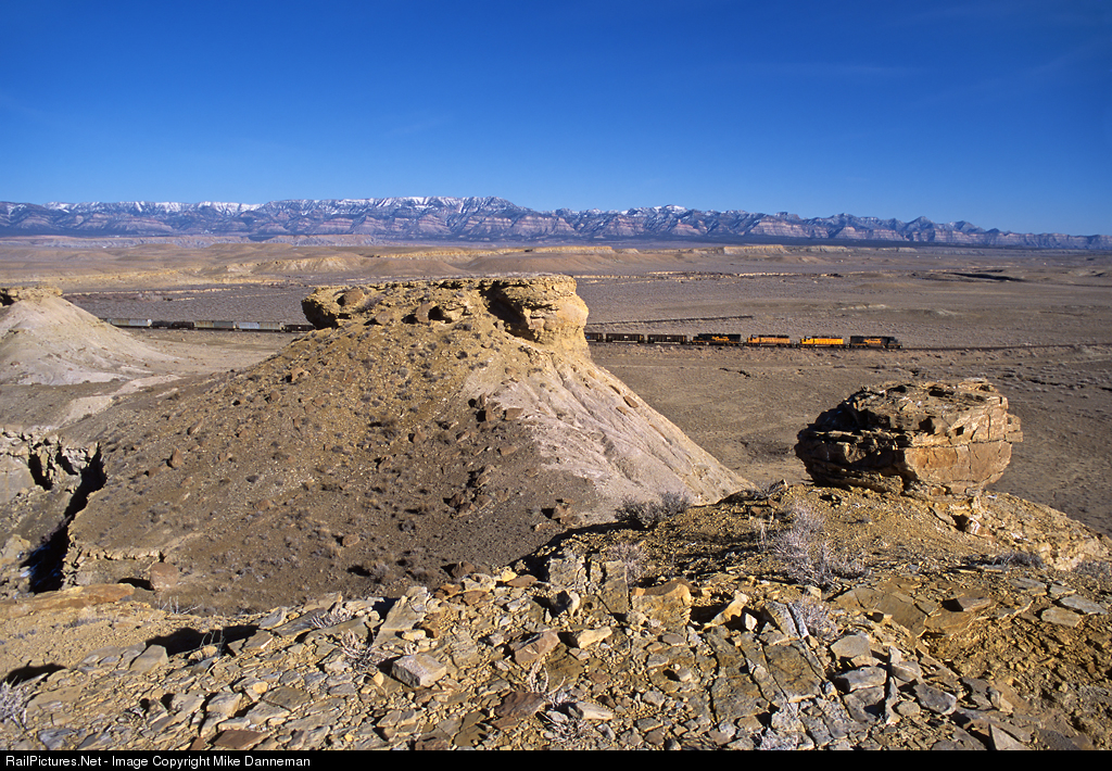 Passing through quintessential desert scenery beneath the Book Cliffs, Union Pacific LJP45 “dirt train” local approaches the junction to the Green River Subdivision main line at Mounds, Utah, on the afternoon of February 2, 2005. A pair of Rio Grande EMD SD40T-2s sandwich a pair of UP SD40-2s for power on the local that is heading back to its origin of Helper Yard.