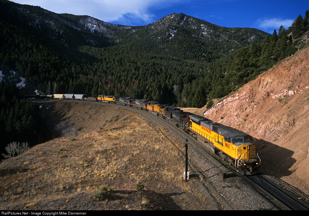 Union Pacific’s Denver to Grand Junction manifest freight crosses the fill over South Draw as it exits Tunnel 16 east of Crescent, Colorado, on the morning of March 30, 2002. Lead locomotive EMD SD9043MAC No. 8162 is at the location of the east portal of old Tunnel 17 that collapsed during construction. The tunnel was bypassed by a shoe fly around the obstruction until removal of the caved in tunnel and excavation of a new cut allowed the track to be laid in its surveyed location.