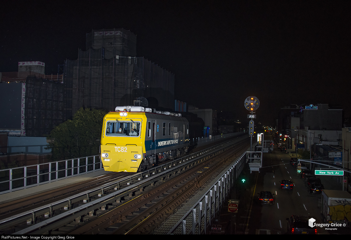 Long Island Rail Road's "TC-82" Track Geometry Vehicle heads west on the Atlantic Branch Viaduct on a nighttime test towards Atlantic Terminal in Brooklyn, NY. The TC-82 is a Track Geometry Vehicle built by Plasser American Corporation for track inspections throughout the Long Island Rail Road system. |