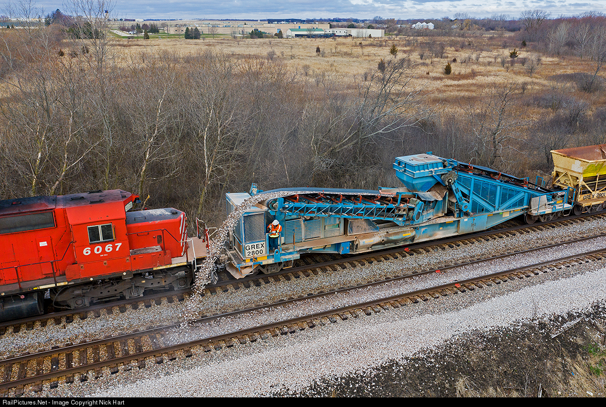 | On April 5th of 2020, the Canadian Pacific ran an eastbound ballast train out of Milwaukee. It's seen dumping along the C&M Subdivision in Pleasant Prairie, WI as a crew member aboard the GREX 2800 keeps an eye on the operation. 2020 has been a busy year for ballast on the CP as many trains have been in and out of Michel's Pit in Waterloo, WI. |