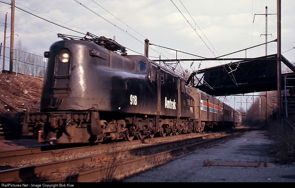 | Amtrak GG-1 918 hustling the "National Limited" between Lancaster and Harrisburg on a cold Sunday afternoon in February of 1976. Maximum track speed on the old PRR main back then was 75 mph. No. 918 was built as the PRR No. 4920 by Altoona/GE in July, 1942. |