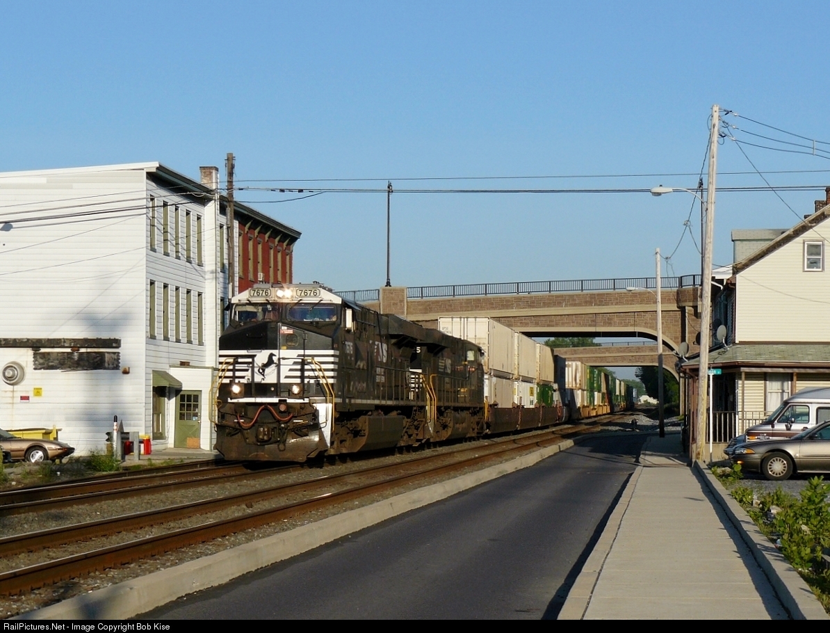 The closest you'll get to street-running in Lebanon, with a view west along Lebanon's Scull St., showing the old Railroad House Hotel (now apartments,) row homes, and the twin Route 72 viaducts. No. 7676 was built as an ES40DC and was later upgraded.