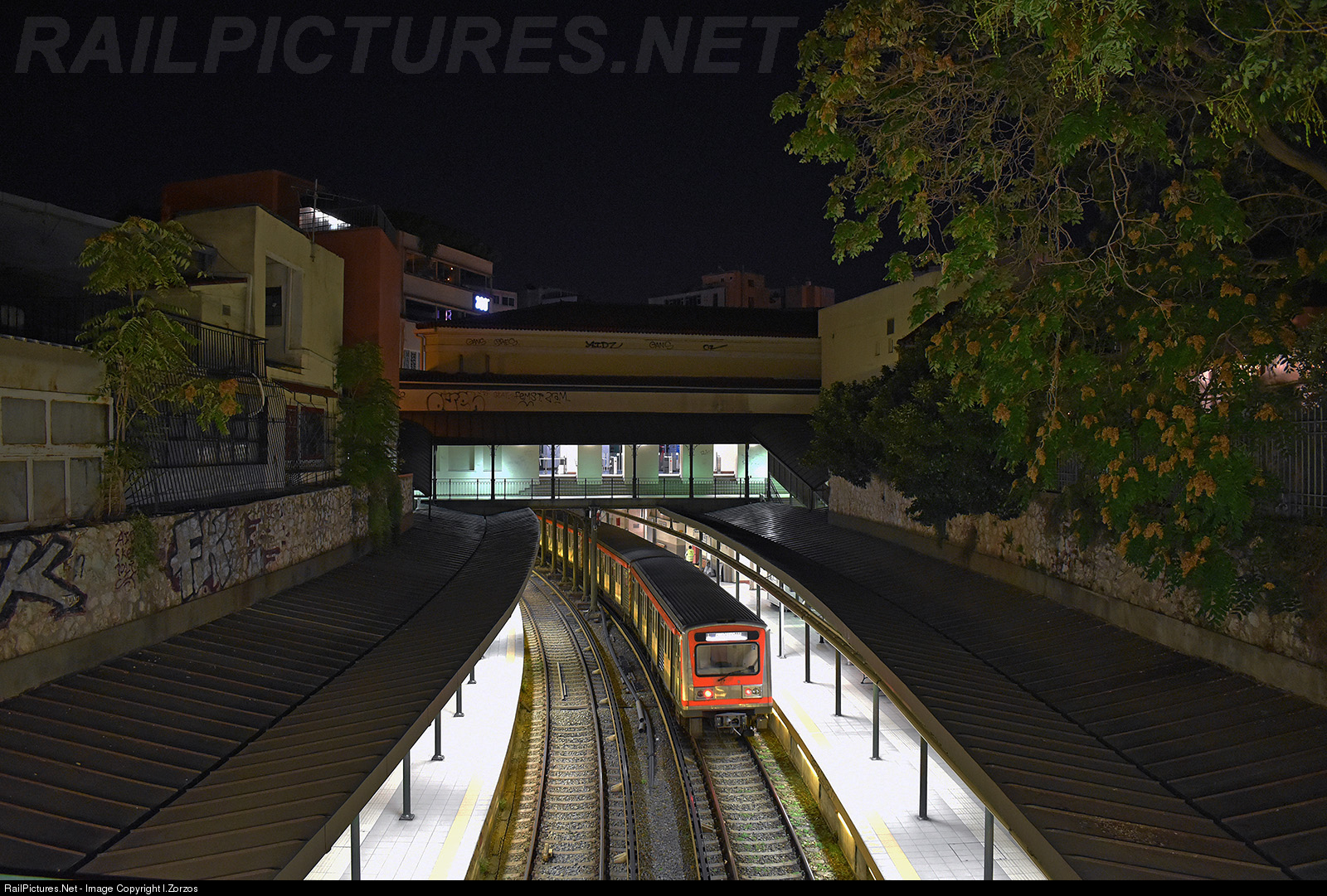 | 1st generation Attiko Metro emu on a dynamic loading gauge test train on Line 1 (Piraeus-Kifissia), inching along the curve at Monastiraki station. |