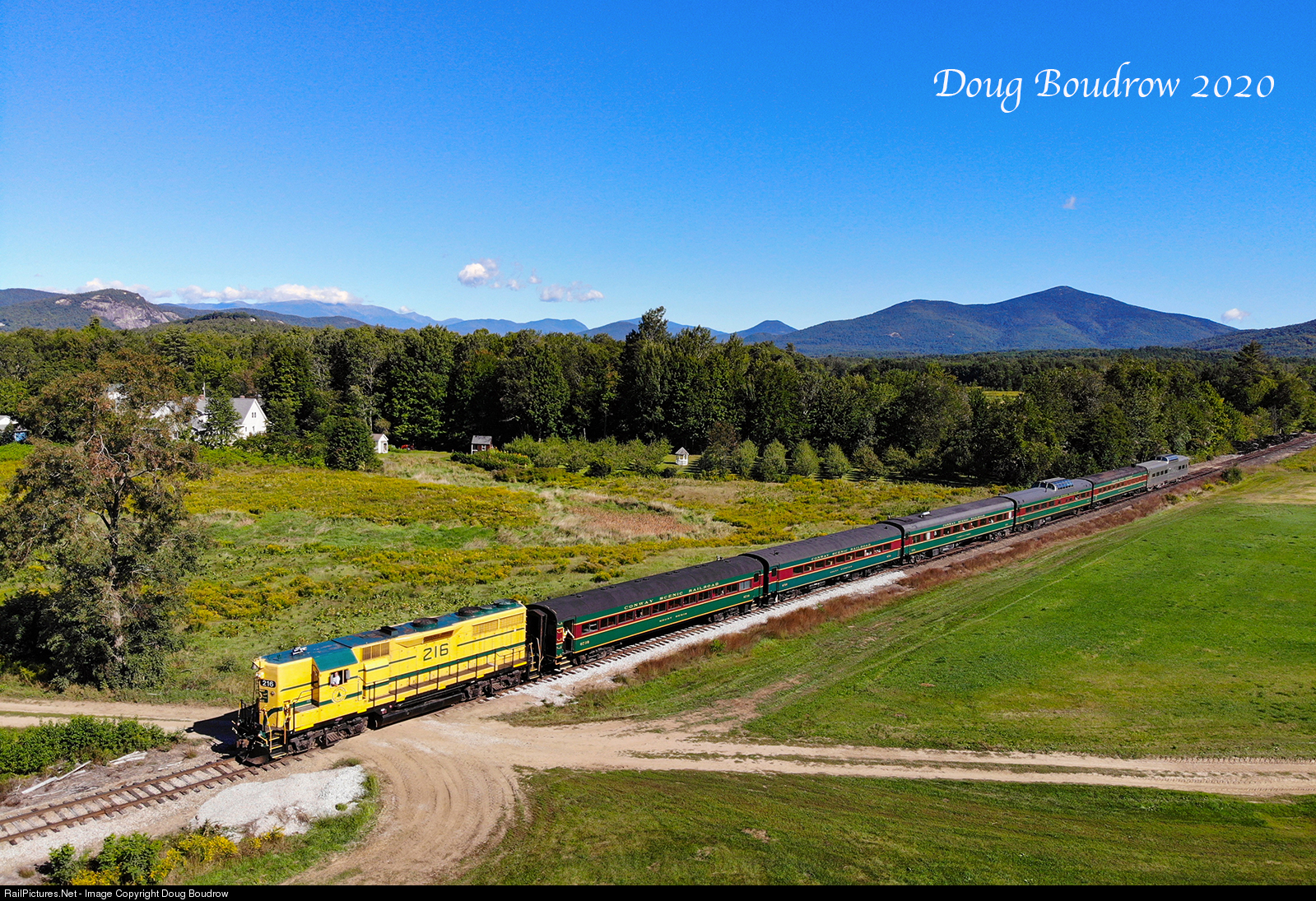 | During the 2020 Railfan's Weekend, the 9:30 Valley Train is seen crossing through Hussey's Farm. The train is actually using the equipment that is usually used on the train to Crawford Notch. Once this train returned to the depot, this equipment was readied to head West to Crawfords and the regular set was used on the rest of the valley trains. |