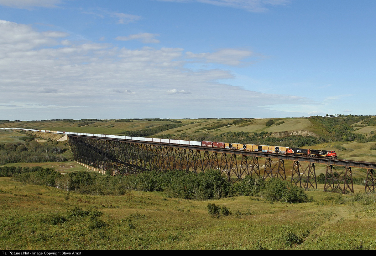 Dash 9-44CW 2673 and SD75I 5686 lead CN 312 over the Battle River Trestle at Fabyan.