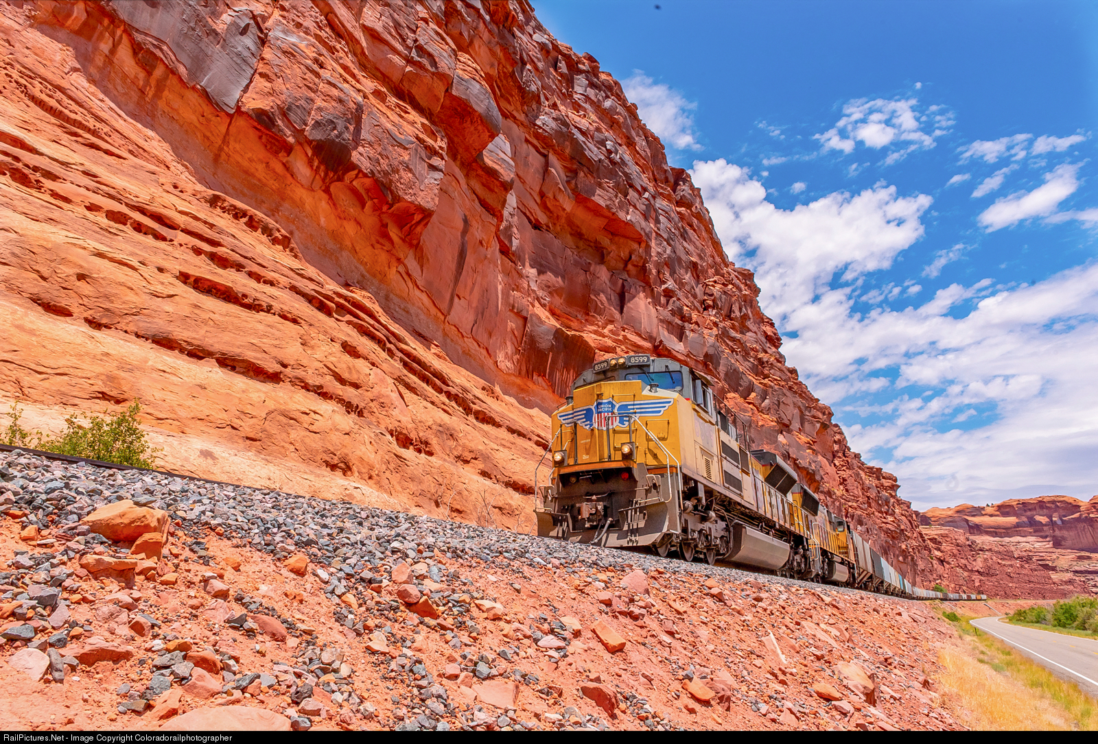June late morning light commands the intense red color of the iron from the magic of Moab. Southbound for Potash the local makes its way down along the mighty Colorado that carved these walls. |