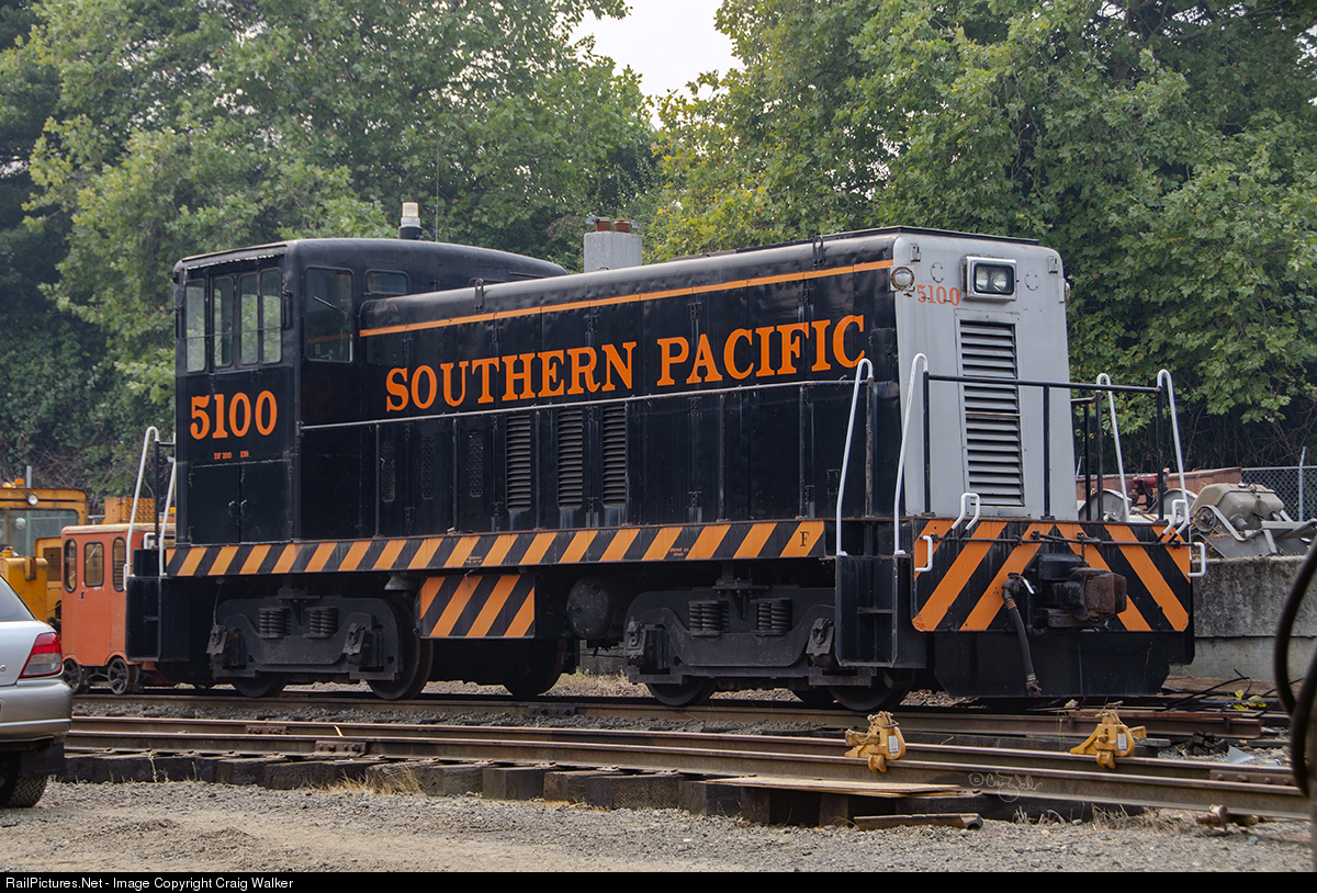 This may look like Southern Pacific 70-ton 5100, and it was in fact Southern Pacific 70-ton 5100 when built by General Electric in April 1949 (and until 12/22/76), but it is actually Oregon Pacific Railroad 70-ton 5100. After its career ended on the SP, this diminutive locomotive was sold to Weyerhaeuser Timber Company on 3/16/77 where, in its new identity as WTCX 5901, is served the lumber company in Springfield OR. In 1988 it was sold to the East Portland Traction Company, which bestowed the original SP number upon it once again (as EPTC 5100). Later that year it became Samuels Steel Products 5100, and eventually, it found its way to EPTC successor OPR, which repainted it into SP colors because … well … why not? It looks great painted that way! (Milwaukie, Oregon – August 22, 2015)
