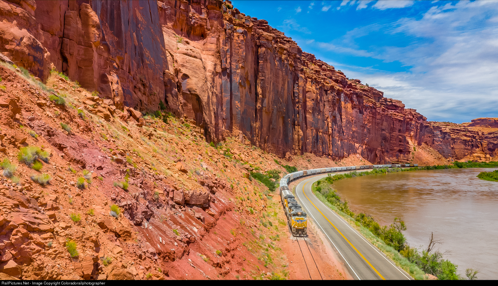 In its most intense form and repeat visits at various times of the year, the iron in these rocks will play a ballet with the tertiary pallet. Union Pacific Armour Yellow and blue wings pop in the late June morning sun along the mighty Colorado. This is some unique railroading on Cane Creek Sub.