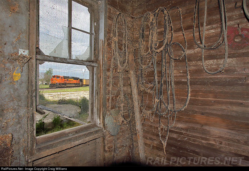 | The old Farmers Co-op Association elevator on the northside of Chariton doesn't sound long for the world. Guy at the feedmill next door said the elevator is privately owned now and plans are to tear it down. With permission I got a shot inside of this westbound empty with a DP on the back. The train is working west on the Ottumwa Sub between Albia and Creston is southern Iowa. |