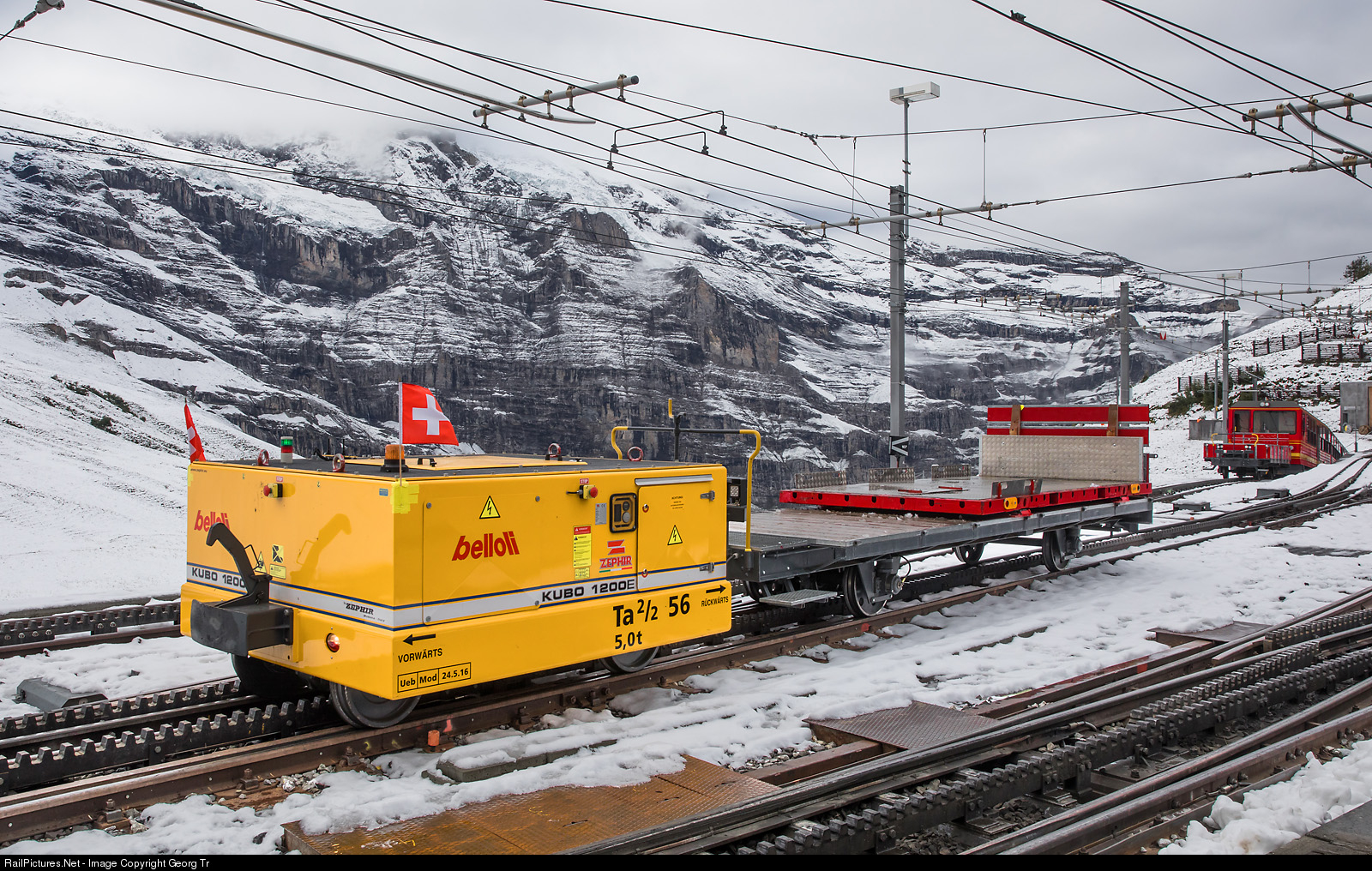 Remote controlled accumulator shunting vehicle Ta 2/2 # 56 of the Jungfraubahn, type KUBO 1200E, built in 2016 by Zephir in Modena/Italy and delivered by the Belloli company in Grono/Switzerland. This little 5 ton shunter has no cogwheel drive like the other vehicles of the Jungfraubahn and is used to move freight cars in the Kleine Scheidegg station area.
