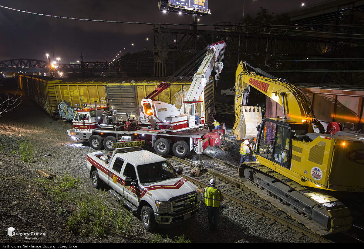 CSX and Cranemasters crews work to remove a damaged boxcar from an earlier derailment at CSX's Oak Point Yard in the Bronx borough of NYC. The derailment resulted in a boxcar splitting a switch and hitting an original New York, New Haven & Hartford Railroad catenary bridge which shut down evening service on Amtrak's Hell Gate Line. |