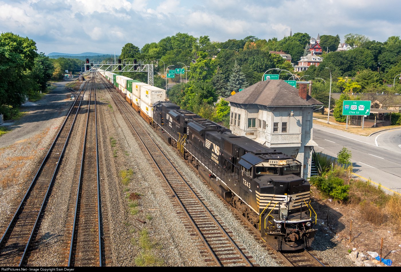 HelperLink-Converted SD70ACUs #7241 and #7243 bring up the rear on 25Z, an intermodal to Chicago. To the right is the iconic ALTO Tower. ALTO controlled this part of Altoona for 97 years, beginning service in 1915, and being decommissioned in 2012. There has been talk of demolishing ALTO, but as of now, its future is uncertain.