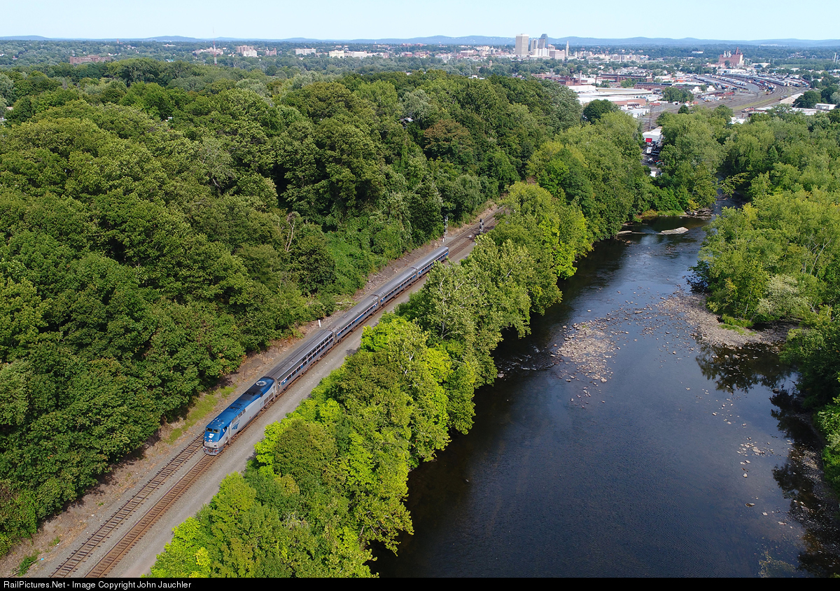 The Chicago-bound Boston section of "The Lake Shore Limited" accelerates out of West Springfield, MA along the Westfield River, preparing for its assault of the Berkshires just ahead. That's CSX's West Springfield Yard and the Springfield city skyline in the background. This train will combine with its New York City section at Albany/Rensselaer, NY in a few hours and continue as Amtrak 49 for the rest of the way to the Windy City.