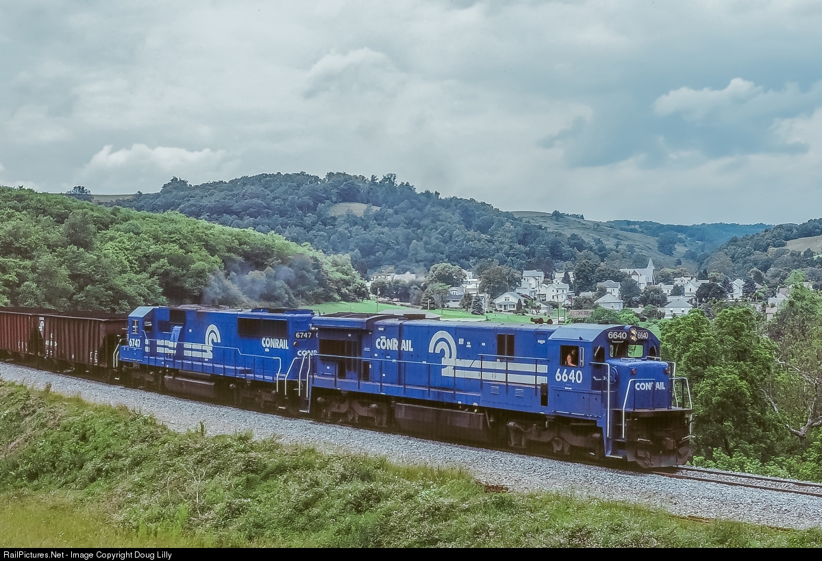 | After crossing the big fill on the Monongahela Railway’s Waynesburg Southern branch, Conrail power passes the town of Rogersville, Pennsylvania. |