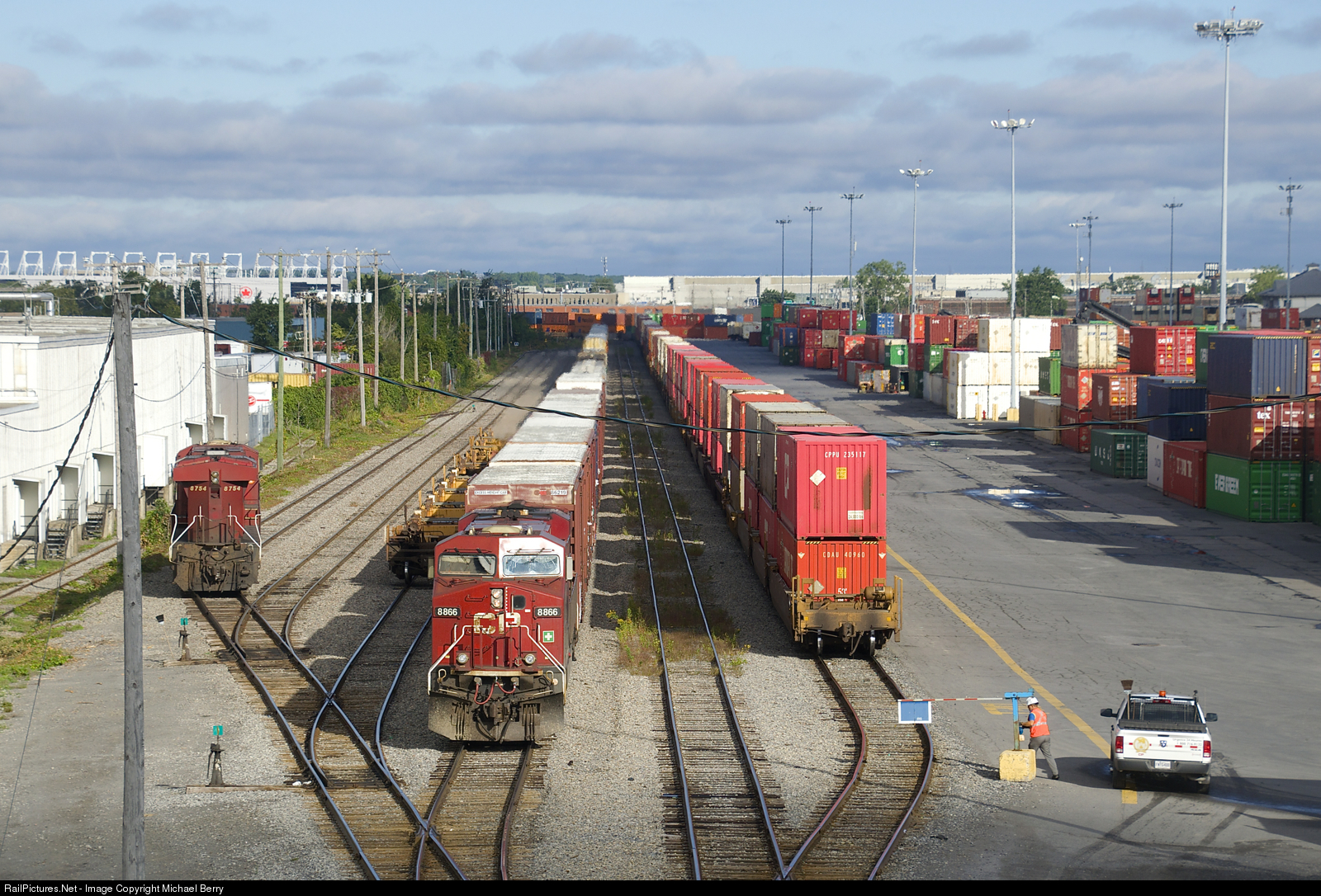 | CP 112 has finished yarding the intermodal portion of its train as an employee puts a blue flag on a cut of cars at right. At left are the mid-train and tail end DPU's (CP 8754 & CP 8519), which will soon be added to the head end. Once that is done, CP 112 will head to St-Luc with the non-intermodal portion of its train (mixed freight followed by autoracks, which had been on the tail end). |
