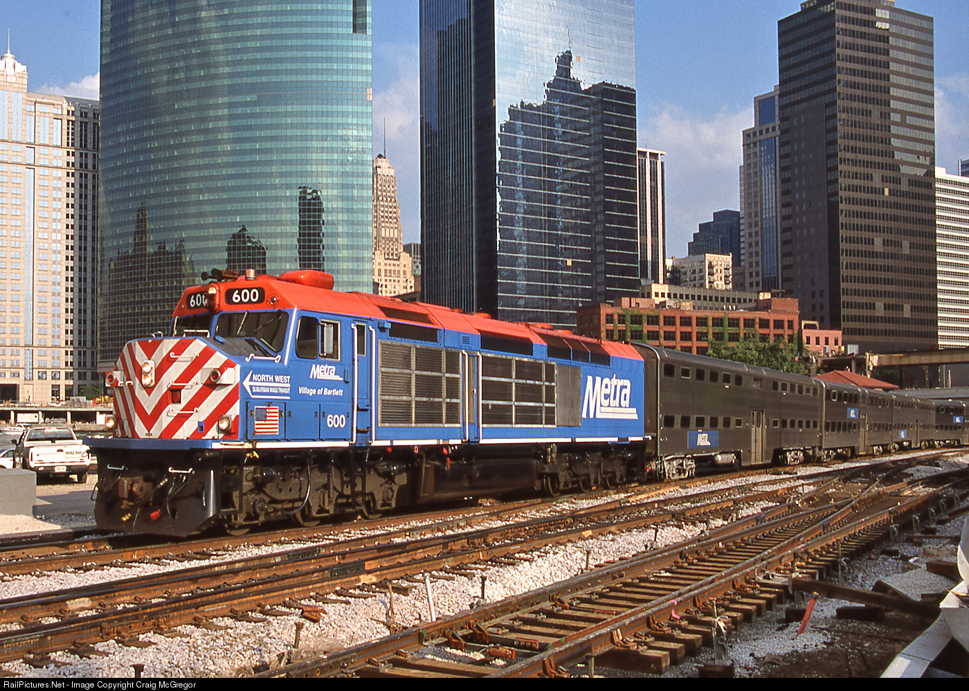 | A venerable F40C pulls another outbound commuter train from Union Station. Notice the track work in the foreground. Provia 100 slide film. |