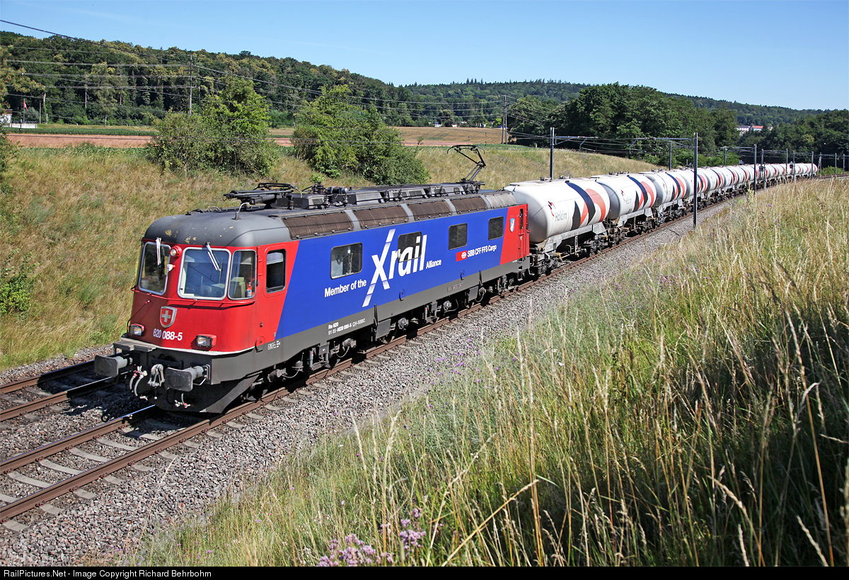 | Re 620 088 with a publicity paint scheme "Xrail Alliance" heads a freight train Dotternhausen (Germany) - Eclépens. |