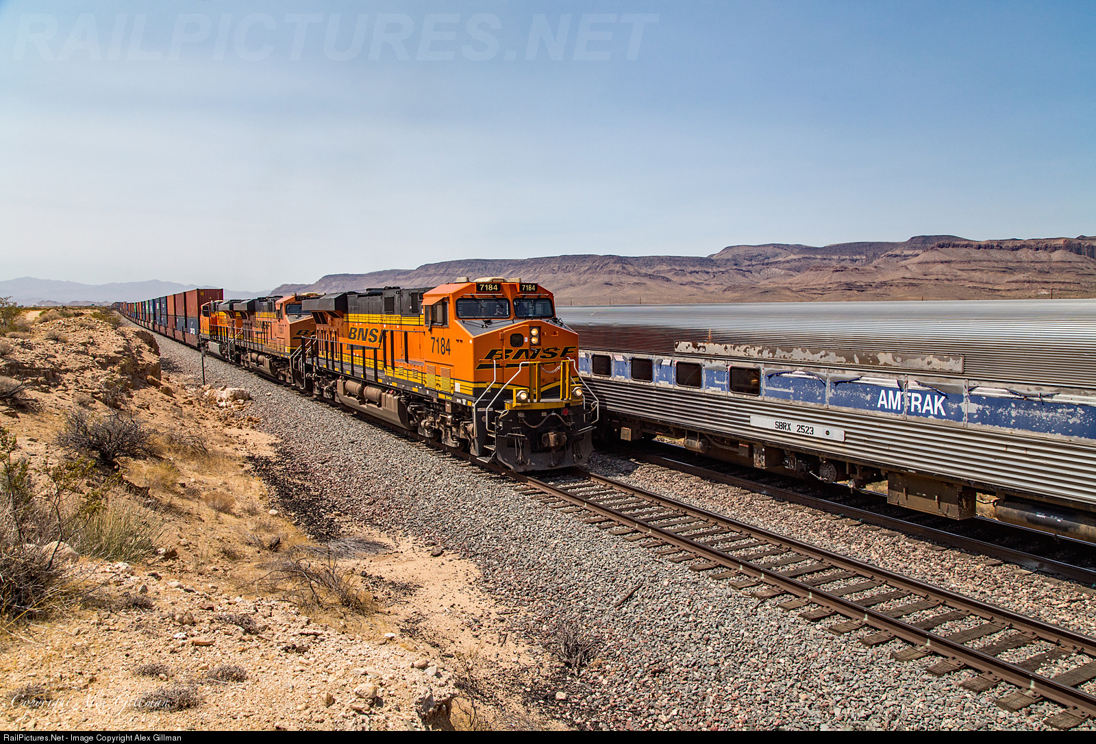 Santa Fe 3751's three new support railcars, baggage car SBRX 1161, dormitory car SBRX 2506 and dormitory car SBRX 2523, have a moment to cool their heels (if that's possible when the temperature is over 100 degrees) as they patiently wait to continue their westbound trip on the rear of an HGALBAR manifest. One of two trains the GALBAR is waiting for is seen here, the BNSF 7184 east, which is made up of double stack containers and a slew of ethanal tank cars on the rear.