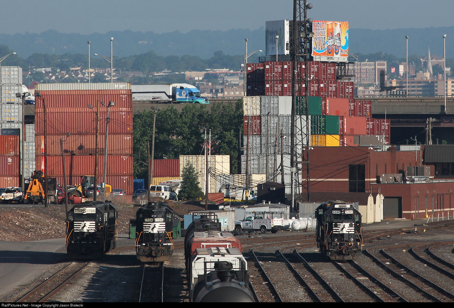 | Eastern Section of Oak Island Yard - The western section of Oak Island yard is most commonly seen in pictures which are taken from the Rt. 9 overpass. Here is a look into the less often seen eastern section of Oak Island Yard. Situated between the NJ Turnpike and Doremus Ave. morning light illuminates several EMD units resting below tall stacks of intermodal contains. |