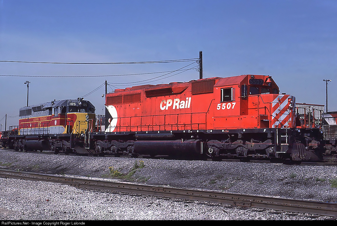 Canadian Pacific SD40 5507 with Algoma Central SD40-2 185 at CP's Agincourt yard in July 1988.