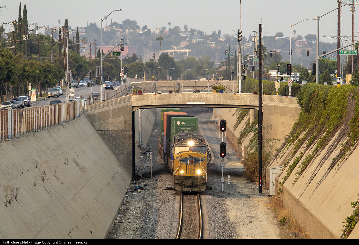 | Union Pacific's ZLCAI heads through the trench in Alhambra at an unusually high speed. The train is normally much longer and just clearing yard limits when it reaches this point, but this rather short train has already had a chance to open up. The orange tint over everything is due to the Bobcat Fire in Monrovia.