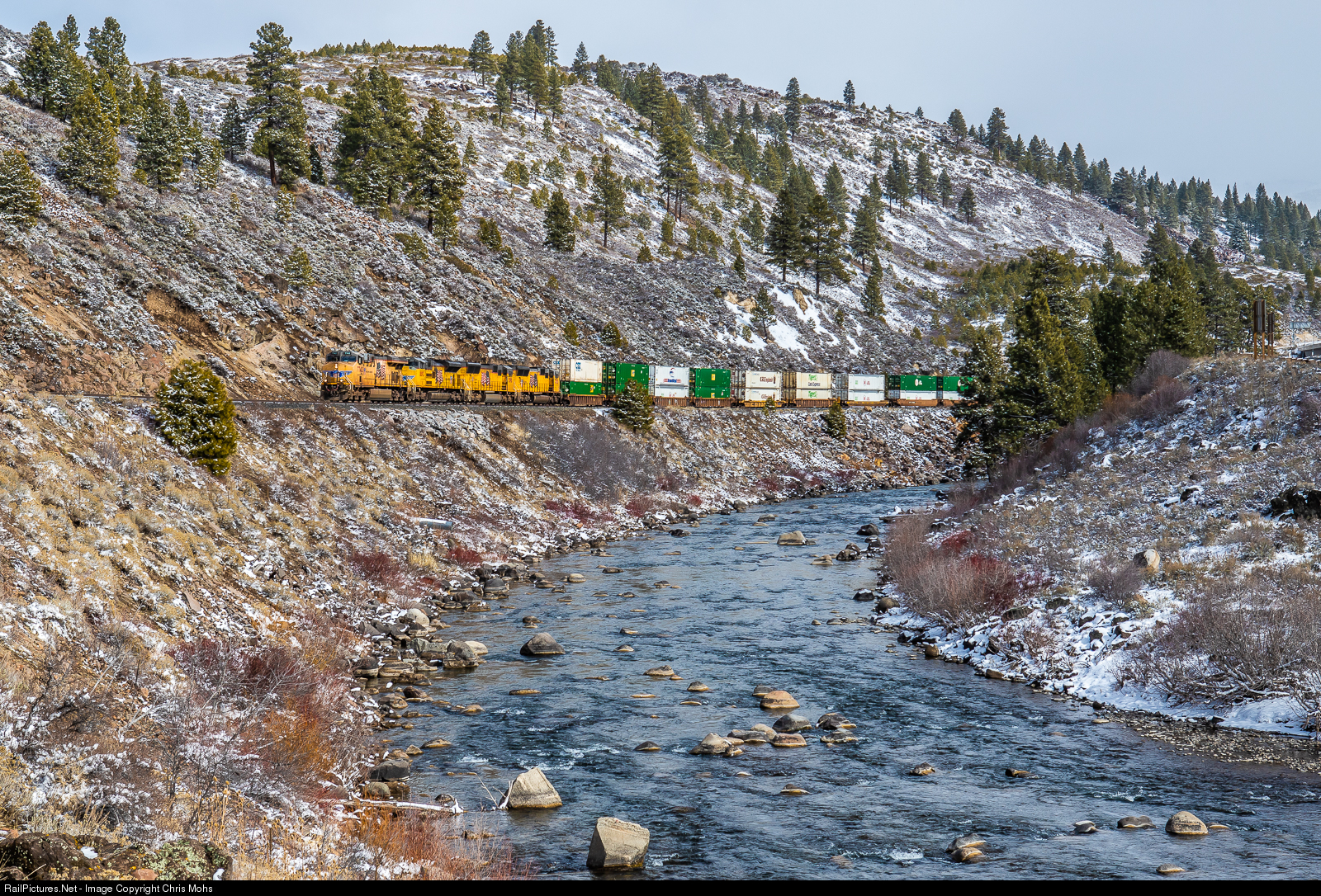 | An overnight Snowfall in the Sierra Nevada mountains has left a dusting of snow. The snow at Boca at 5528 ft is already melting in the morning sun's warmth. Union Pacific ES44AC No. 7742 with westbound Stacks round along the Truckee Rive,r climbing up the eastern slope of the Sierras through the Truckee River Canyon to Donner Pass. |
