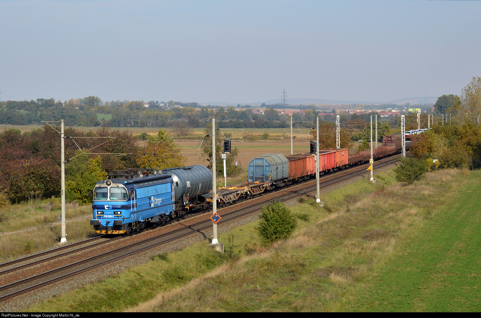 | The electric locomotive 230.035-8 hauling a multi-group freight train from Brno-Maloměřice to Břeclav, approaching to passenger stop in Žabčice. |