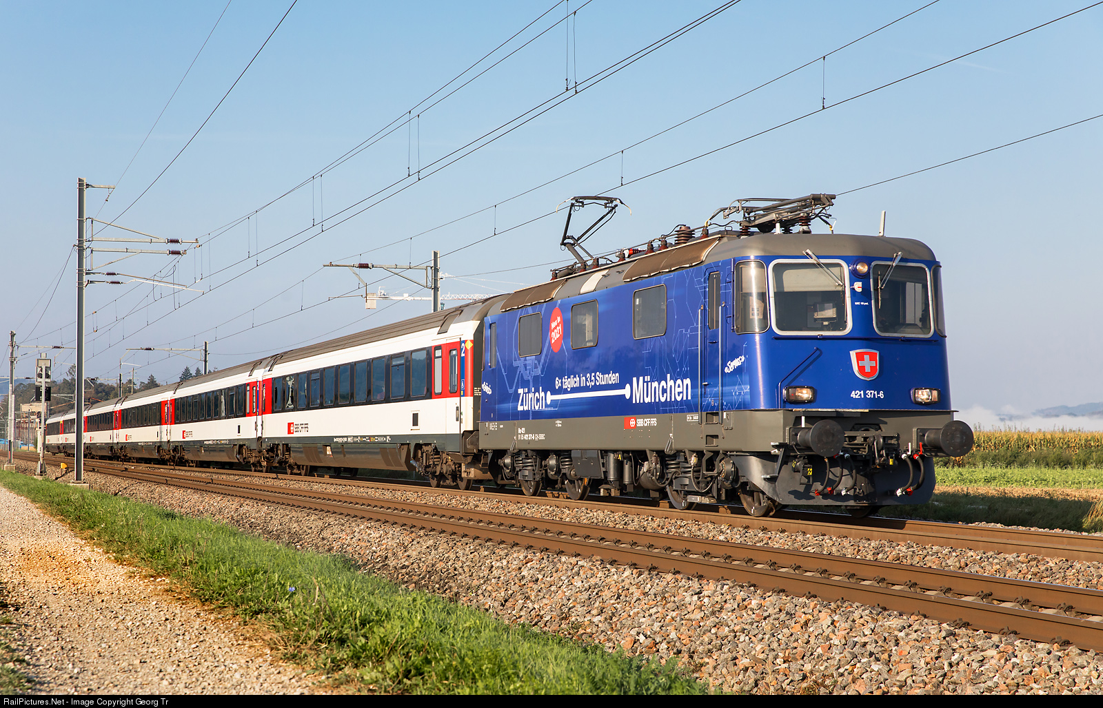 | Re 421 # 371 of the SBB, rented by the passenger division from SBB Cargo and in the publicity paint scheme (adhesives) for the new timetable Zürich-Munich, is pulling the IC 282 of the line IC4 Zürich-Schaffhausen-Singen-Stuttgart, between Hüntwangen-Wil and Rafz. The Re 421 is in charge from Zürich HB to Singen (Hohentwiel)/Germany. The cars are 5 second class Bpm and 1 first class Apm of the SBB. |