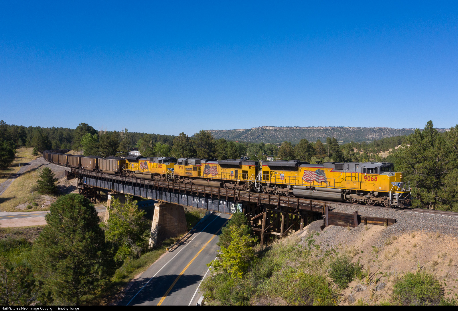 | UP 9068, 8711 and 8920, all flag units, lead a southbound coal load across the old Santa Fe bridge at Larkspur, CO, on Sept 12, 2020. |
