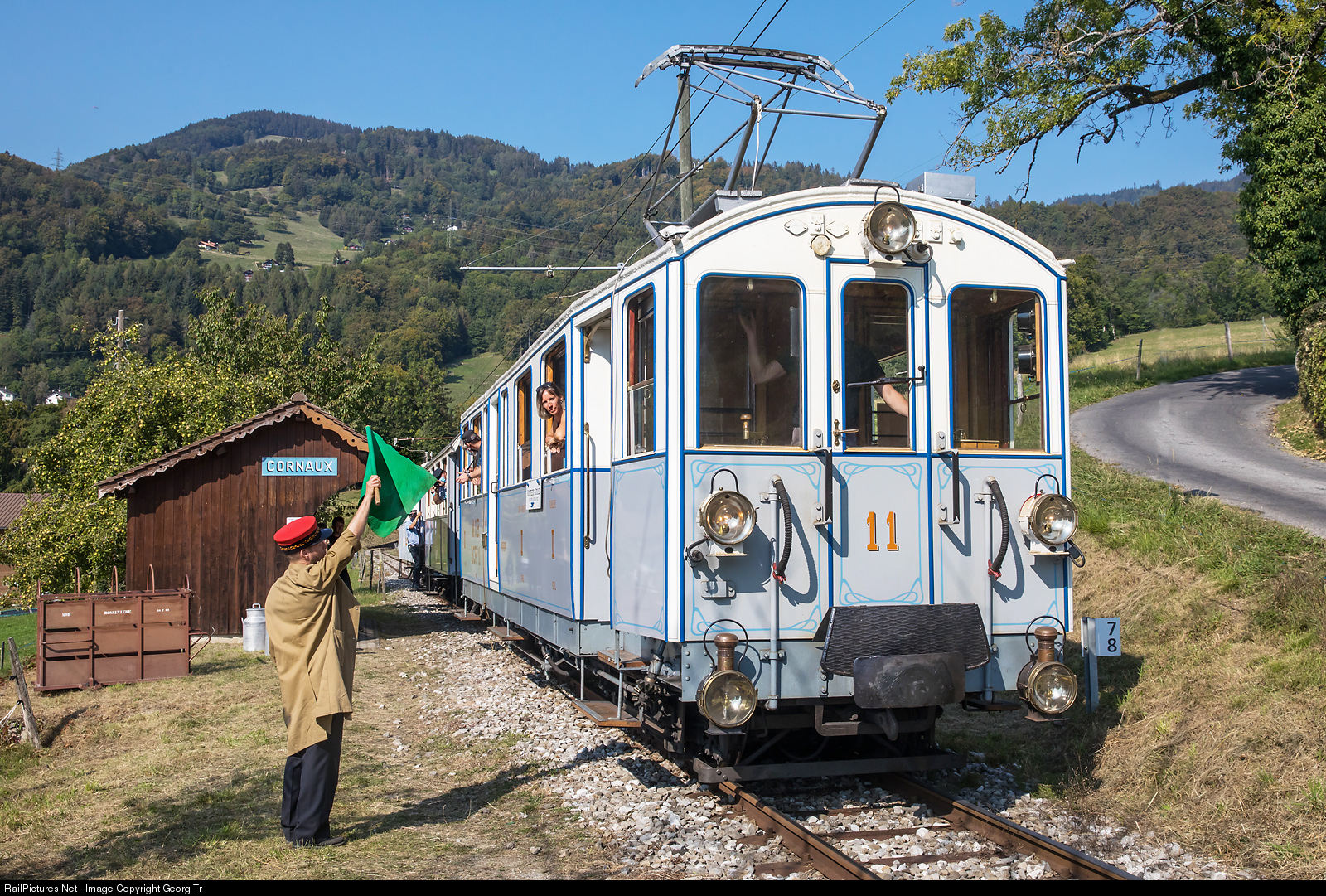Electric railcar BCFe 4/4 # 11 (with second and third class and bagagge compartment) of the Blonay-Chamby railroad museum is leaving the Cornaux stop with a passenger train from Blonay to Chaulin Musée. The railcar was built in 1905 by SIG and Alioth for the Montreux-Oberland Bernois (MOB) railway.